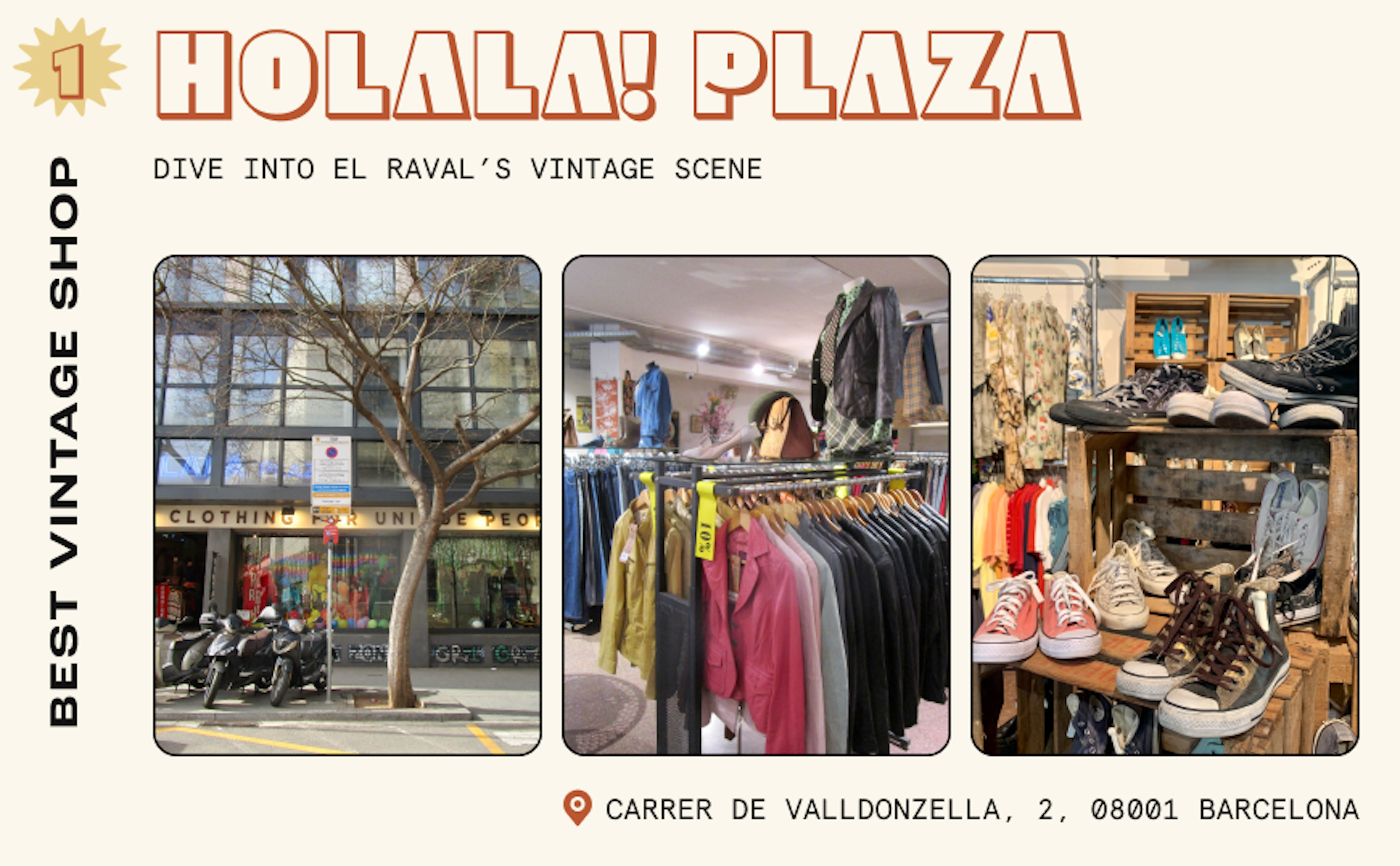 Barcelona has a thriving world of vintage design, with El Raval its main hub. For Ibiza-born Holala! Plaza, garments are collected from flea markets, textile factories and shops all over the world, then shown off in this wonderland of vintage design overlooking Plaça de Castella. Inside, there’s a fun vibe, with posters all over the walls and decorative surfboards dotted around.